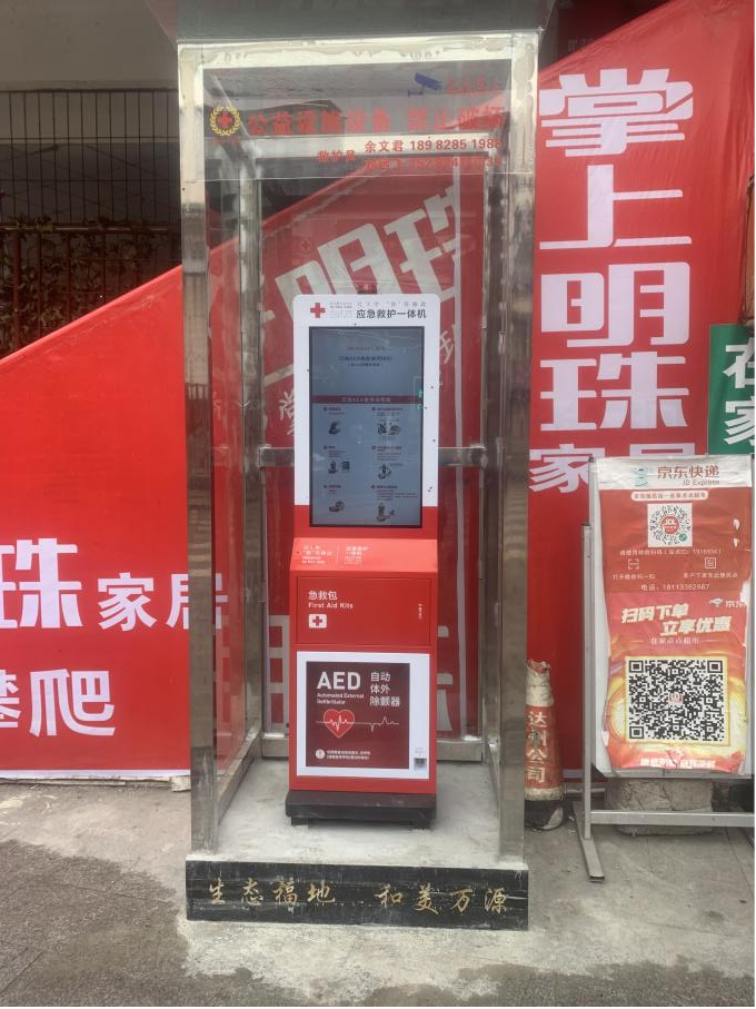 近日,万源市红十字会依法委托中国邮政万源分公司在翡翠江畔中国富硒美食城、达州长途通信传输局万源分局大门口、万源中学农商银行取款机附近、中心广场(原招待所附近)、市政务服务中心大门口、东门农贸市场(万白路)路口、火车站“醉月楼”小区对面购置安装了7台红十字应急救护一体机(俗称:AED)。