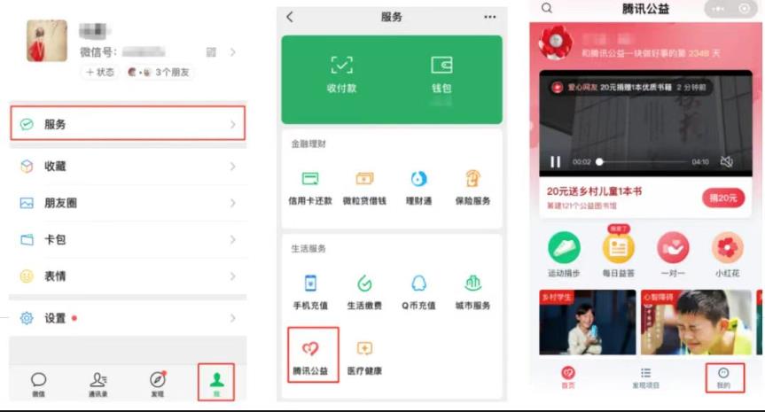 3、好友助力加倍得配捐。捐赠者的爱心可以通过好友助力来加倍放大。打开微信,点击右下角我→服务→腾讯公益→查看好友为我助力的情况→邀请好友助力,分享给微信好友群或朋友圈,让好友通过送小红花、答题、捐1元的方式进行助力,以此争取更多的当天腾讯配捐额。