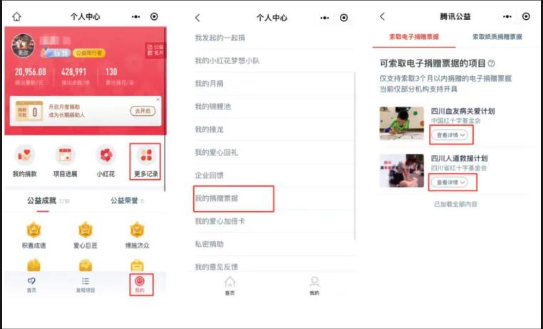 4、扫码捐赠票据开具。根据《中华人民共和国慈善法》第三十八条之规定,捐款人可索取捐赠票据,依法抵扣税金,由四川省红十字基金会统一开具电子捐赠发票,请打开微信-我-服务-腾讯公益-我的-更多记录-我的捐赠票据-查看详情-申请捐赠票据,请填写实名制开票信息索取电子票据。